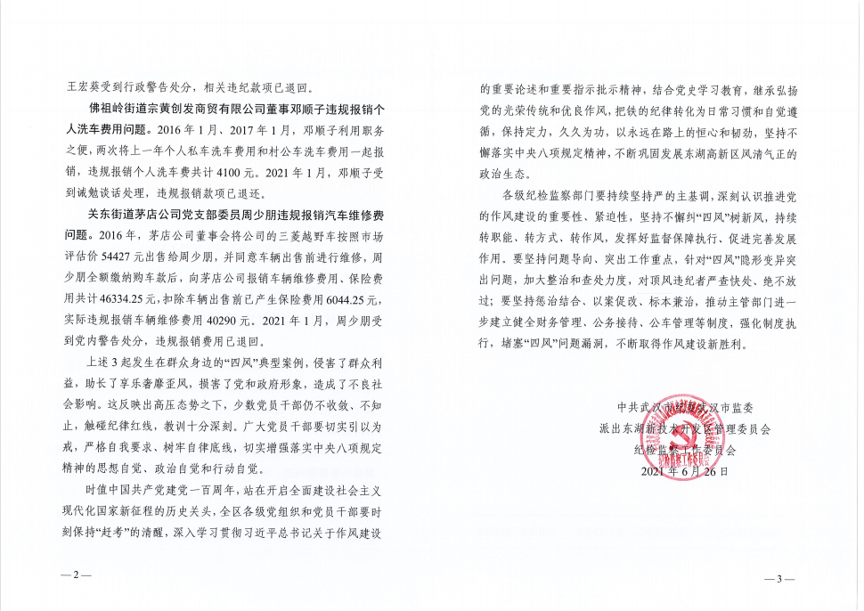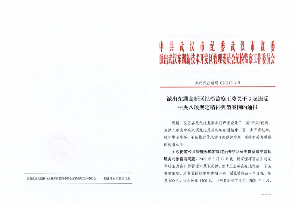 派出东湖高新区纪检监察工委关于3起违反中央八项规定精神典型案例的通报