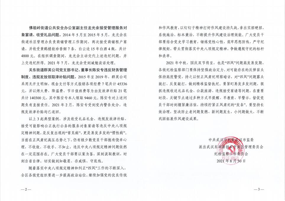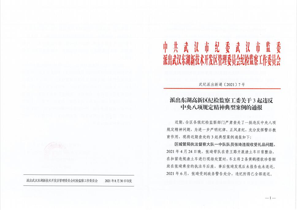 派出东湖高新区纪检监察工委关于3起违反中央八项规定精神典型案例的通报