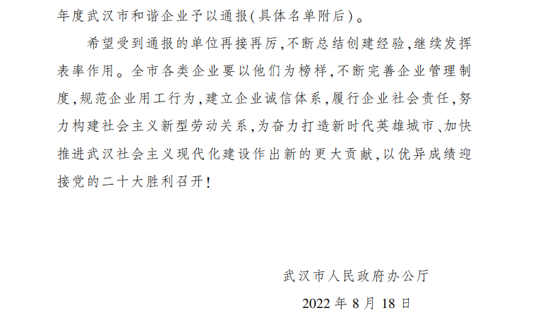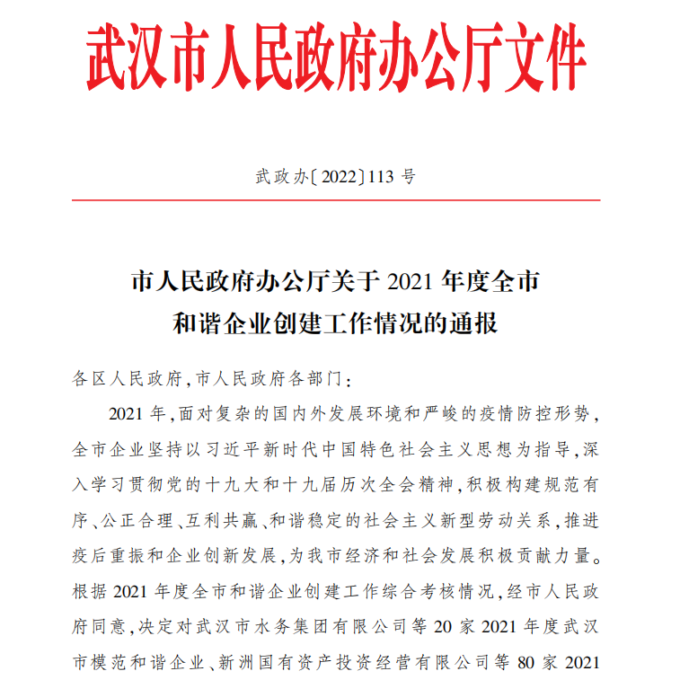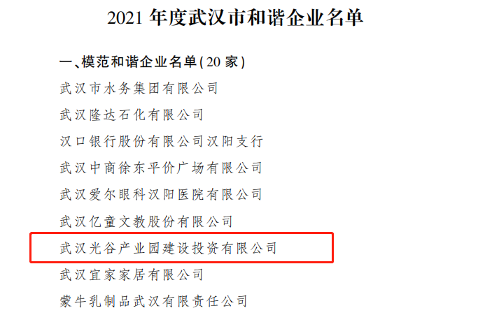 近日,武汉市人民政府办公厅发布了《2021年度全市和谐企业创建工作情况的通报》,武汉光谷产业园建设投资有限公司继荣获武汉市和谐企业、职工心灵加油站称号后,获评“2021年度武汉市模范和谐企业”荣誉称号。